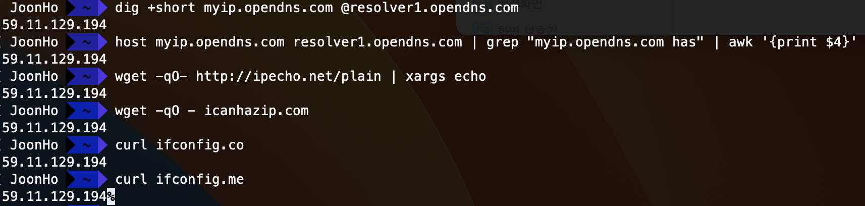 리눅스 터미널에서 4가지의 방법으로 현재 나의 Public IP를 확인 할 수 있다.